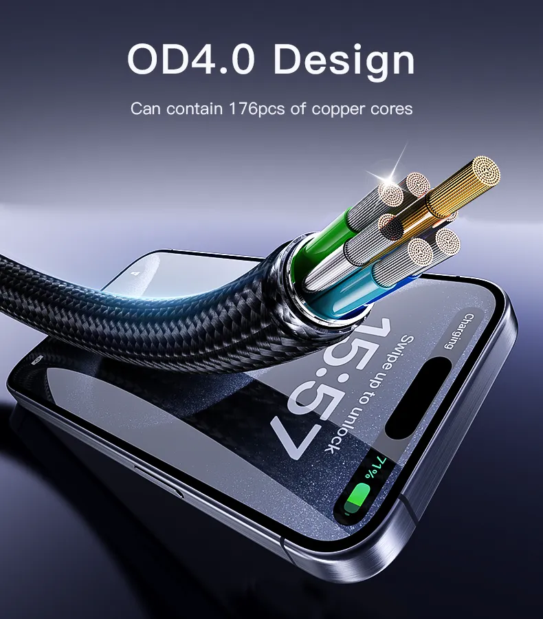 - جنس مقاوم و باکیفیت: ساخته شده از آلیاژ آلومینیوم، TPE و روکش نخی بافتهشده، که مقاومت بالایی در برابر پارگی، خمیدگی و گرهخوردن دارد.