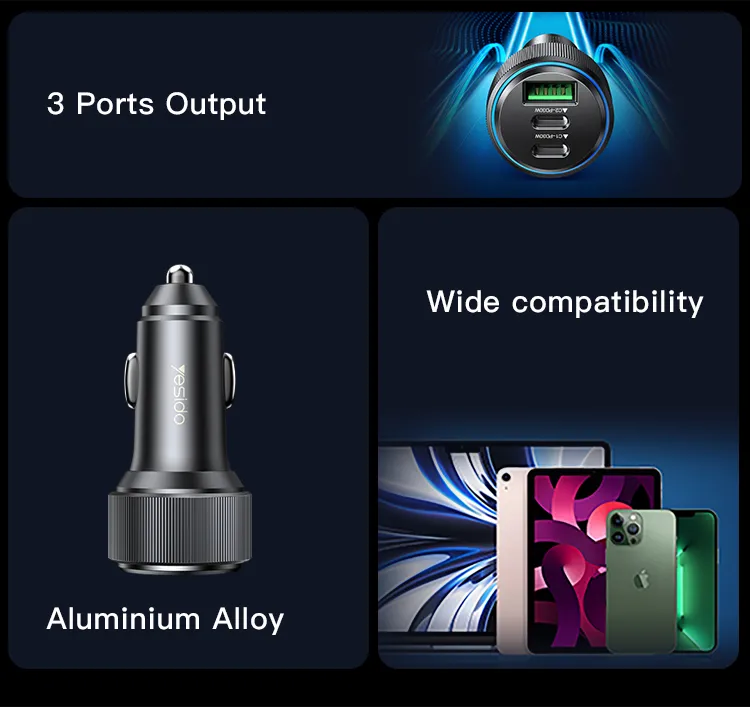 شارژر فندکی 60 وات یسیدو مدل Y50: شارژ سریع سه پورت برای گوشی و تبلت در خودرو