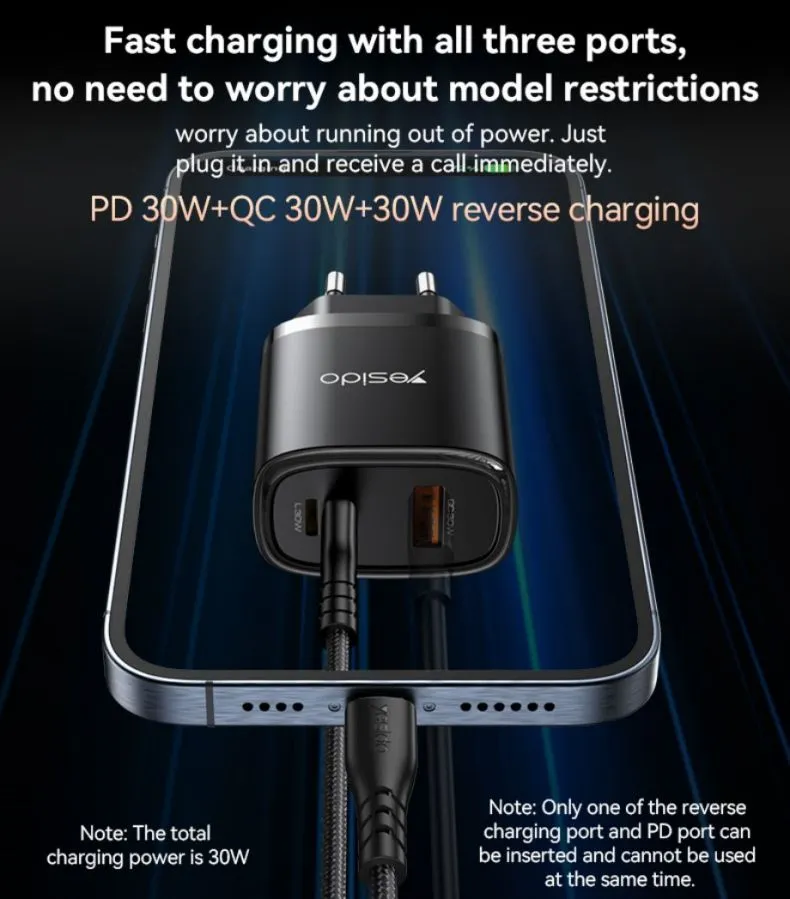 • مدل: YC52 شارژر خانگی 30 وات با شارژ سریع (پورت USB + Type-C + لایتنینگ)