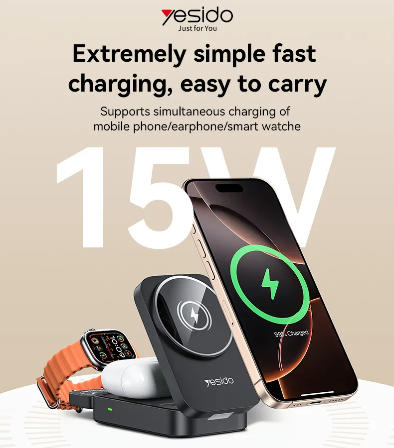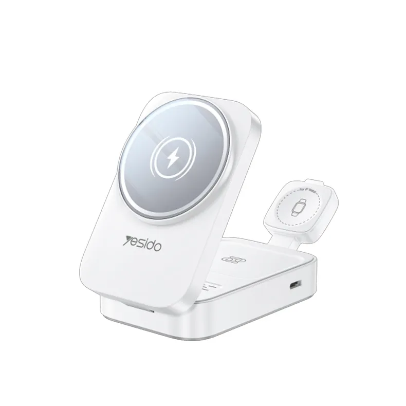 شارژر وایرلس یسیدو مدل DS27، یک داک شارژ بی‌سیم تاشو و 3 در 1 با طراحی شیک و کاربردی است که برای شارژ همزمان گوشی‌های هوشمند، ساعت هوشمند و هدفون‌های بی‌سیم طراحی شده است. این شارژر با بهره‌گیری از فناوری پیشرفته شارژ بی‌سیم، امکان شارژ سریع با توان‌های خروجی متنوع (5 وات، 7.5 وات، 10 وات و 15 وات برای گوشی، 5 وات برای هدفون و 2.5 وات برای ساعت هوشمند) را فراهم می‌کند. با راندمان شارژ 75% و فرکانس کاری 110K~205KHz، این محصول عملکردی پایدار و ایمن ارائه می‌دهد.