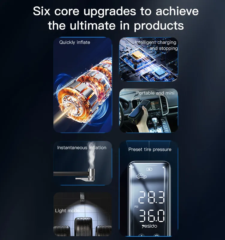 پمپ باد یسیدو VC05 با کارایی بالا، طراحی ارگونومیک و قابلیتهای هوشمند، انتخابی عالی برای رانندگان و افرادی است که به دنبال یک ابزار باد کننده قابلاعتماد هستند. همین حالا این محصول را تهیه کنید و از راحتی و کارایی آن لذت ببرید!
