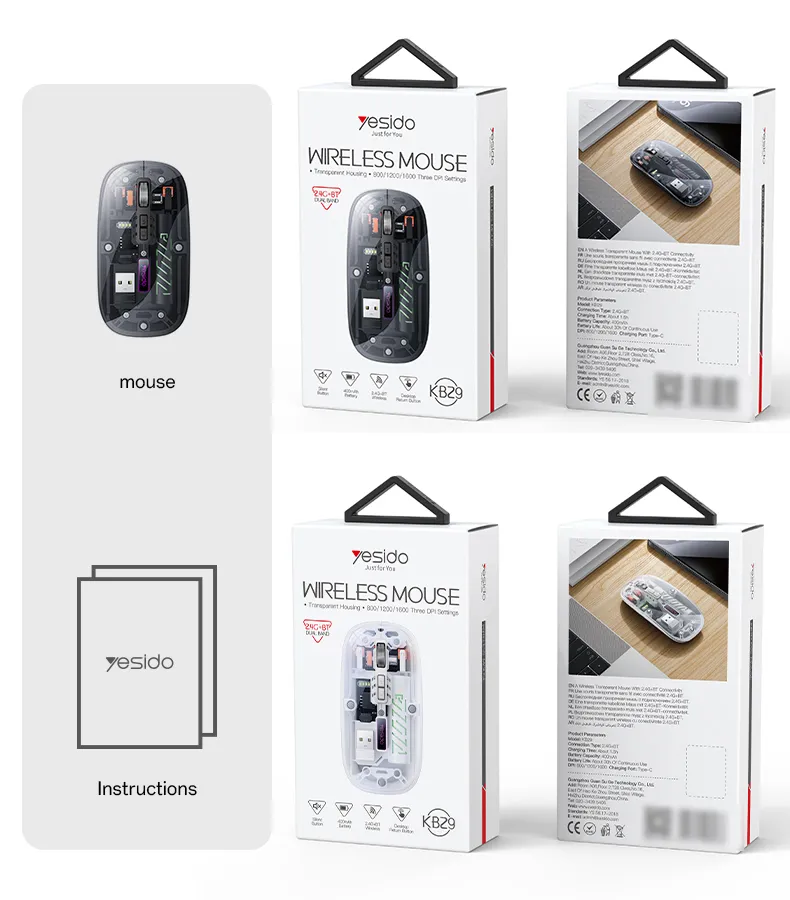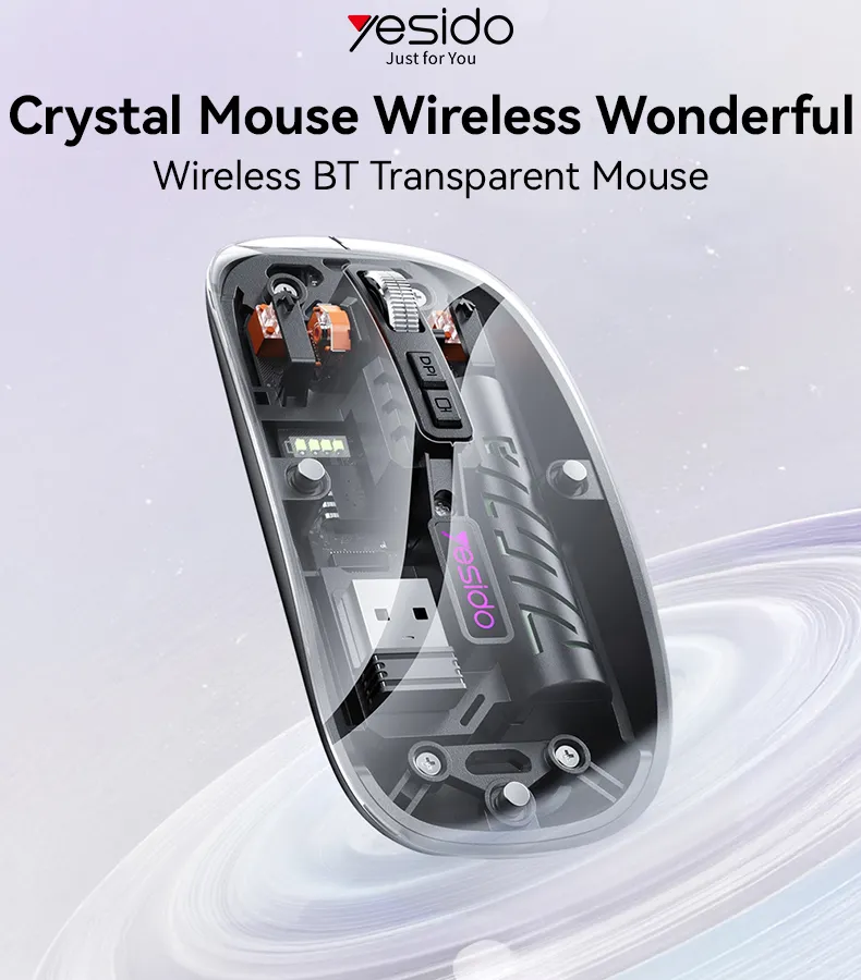 ماوس بی سیم شفاف یسیدو KB29 – ماوس بلوتوثی + 2.4G دوحالته با طراحی کریستالی شفاف، دکمههای بیصدا و باتری قابل شارژ!