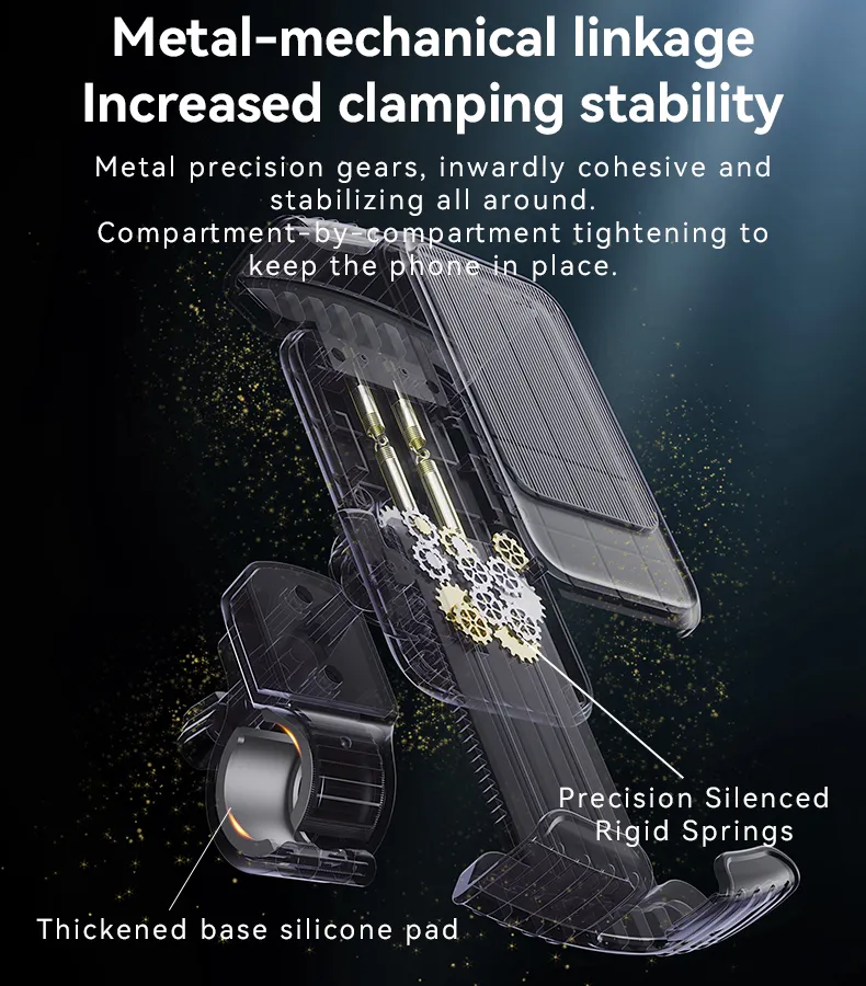 • گیره خودکار و گسترده: گیره با بازشونده دستی و بازوی گسترده برای گوشی‌های 4.7 تا 6.8 اینچی، با پدهای سیلیکونی ضخیم برای محافظت کامل.